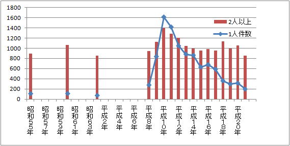 | 平成16年 | 1,666 | 558 | 225 | 277 | 500 | 392 | 68 | 1 |