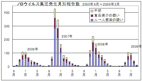 ☆ ノロウイルス集団発生月別報告数(感染経路別) 2005年9月〜2009年3月 (2009.05.21作成)