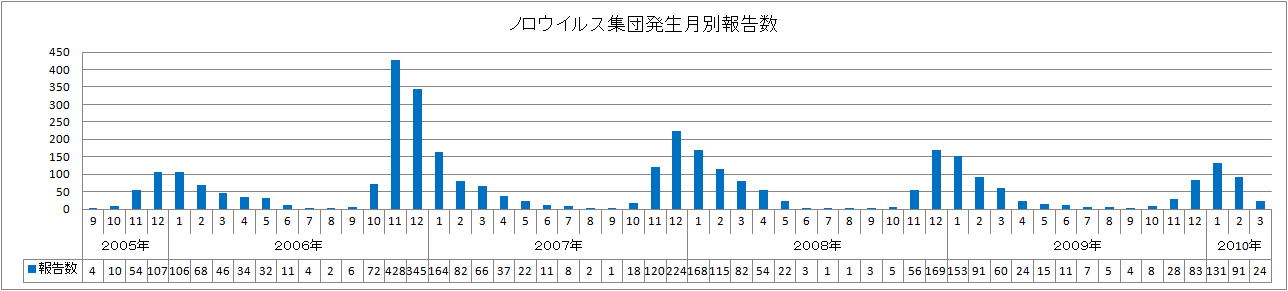 2006年〜2007年にかけてノロウイルスの爆発的な流行はゲノタイプGU/4によるものであった。このあともこのGU/4がノロウイルス感染症の主役であった。
