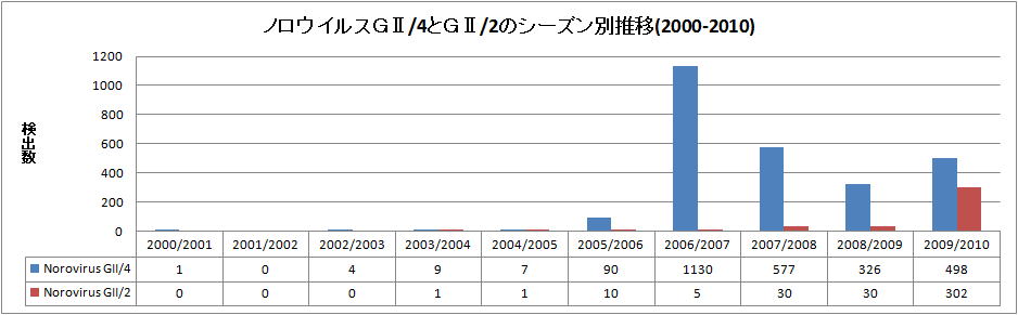 このGII/4とGII/2という二つのタイプの過去の状況をみるため、シーズン別胃腸炎ウイルス検出情報(*3)からGII/4とGII/2を抜き出しグラフ化した。